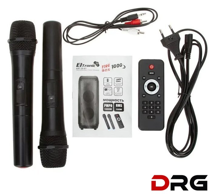Комплектация | - пульт ДУ- два беспроводных микрофона- аудиокабель 3.5 мм - 2RCA- кабель питания- документация |